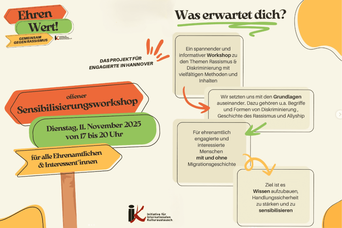 Die Initiative für Internationalen Kulturaustausch e. V. lädt am 11. November 2025 um 17:00 Uhr im Rahmen des Projekts „EhrenWert! Gemeinsam gegen Rassismus“ zum offenen Sensibilisierungsworkshop ein. Eingeladen sind alle Interessierten unabhängig von Vorerfahrungen oder Hintergrund.