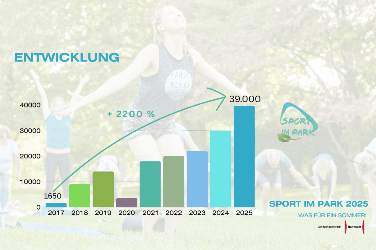Die diesjährige "Sport im Park"-Saison verzeichnete rund 39.000 Teilnahmen & war damit noch erfolgreicher als 2024. Erfreulicherweise konnten weitere Vereine als Anbieter gewonnen werden, darunter erstmals der FC Schwalbe, der TuS Davenstedt, der Polizei SV, der TV Kleefeld und der Kanu-Klub Limmer. Der VfL Eintracht Hannover bleibt mit 20 wöchentlichen Angeboten der größte Anbieter im Programm.