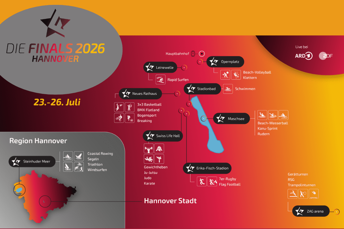 Ausführliche Informationen rund um die FINALS werden auf der FINALS-Website nach und nach veröffentlicht. Je nach Planungsfortschritt der Sportverbände können Sie dort auch Karten für die Wettkämpfe erwerben.